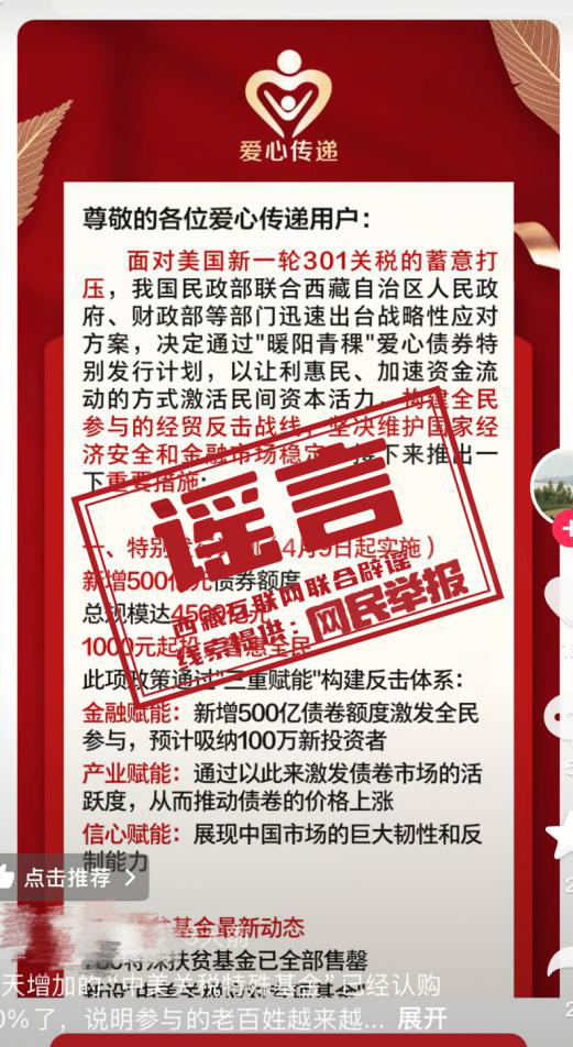 请广大网民警惕各类以“公益、慈善”为幌子,以爱心捐赠的方式引诱他人通过个人账户转账缴费获取债券项目。请大家时刻保持警惕,选择正规投资渠道,守护好自己的“钱袋子”,避免财产损失。